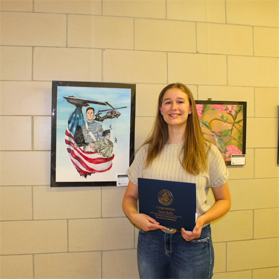 Presley, a junior at Corinth High School, earned this honor for her watercolor painting titled “Legacy.” Abigail is the daughter of Edward and Michelle Presley. Her art teacher is Jennifer LeGoff at Corinth High School. "Military service is a big part of our family's life," Abigail said. "I appreciate this recognition for my family and my artwork." "I could tell she was immensely talented from the first time I saw her work," Corinth High School Art Teacher Jennifer LeGoff said. "She has come into her own and gained so much confidence." The Congressional Art Competition is an annual event that highlights and encourages the creative talents of high school students across the country, with one winner selected from each congressional district. Presley’s artwork will be displayed in the U.S. Capitol for one year, and she will receive two airline tickets to attend the national awards ceremony in Washington, D.C., this summer. 2nd Place: Isabella Hancock, Hernando, MS – Acrylic painting titled “King of the Jungle” 3rd Place: Carley Foster, Booneville High School – Acrylic painting titled “Luke 16:10” 4th Place: Hannah Horton, New Albany High School – Acrylic painting titled “Dance With Me?” 5th Place: Aylin Hernandez, Corinth High School – Artwork titled “Sophia’s First” 5th Place: Isaac Snodgrass, Alcorn Central High School – Pencil drawing titled “Best Friend” For more information about the Congressional Art Competition, contact melinda.whited@mail.house.gov. |